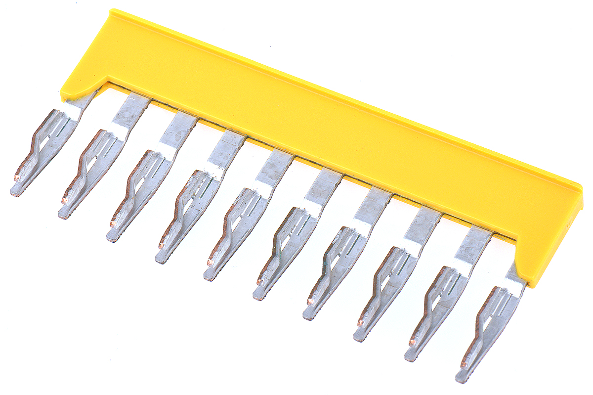 This is 10-Pole Cross Connector manufactured by RS Pro. The manufacturer part number is 899-7851. The product is highly suitable for 4 mm spring terminal. It is a type of jumper bar accessory.