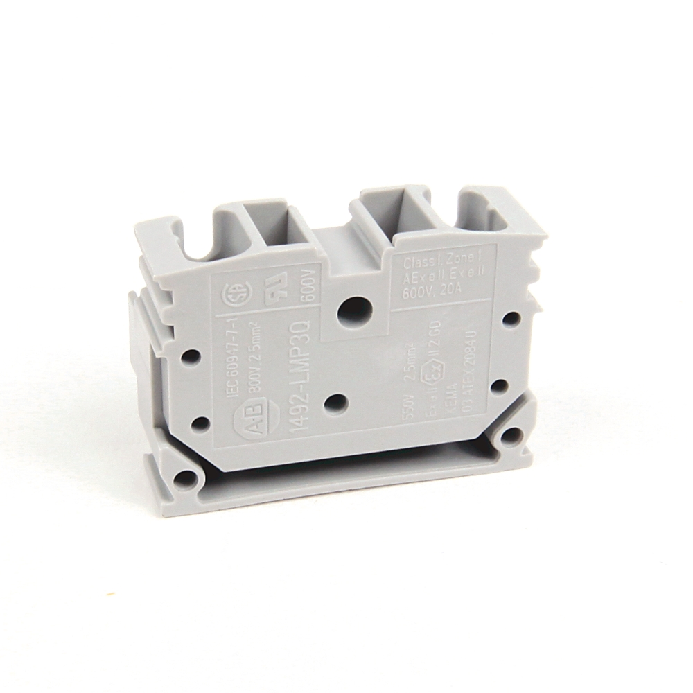 This is Blue 1492 DIN Rail Terminal Block 26-12 AWG 2.5mm² 600 V 800 V manufactured by Rockwell Automation. The manufacturer part number is 1492-LMP3Q-B. Features 26 → 12awg - American Wire Gauge. The product has a current rating of 20 a, 24 a, 25 a. Moreover, the product has a nominal 600 v, 800 v voltage rating. The product 1492, is a highly preferred choice for users. It has a decent blue colour. It allows feed through termination method. The cross section area of the cable includes 2.5mm².
