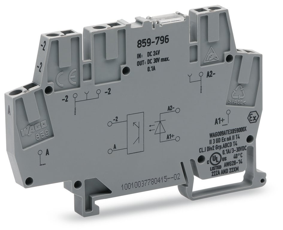 This is 859 Series Optocoupler Terminal Block 2.5mm² Cage Clamp Termination manufactured by WAGO. The manufacturer part number is 859-796. It is fused no . Whereas, the minimum operating temperature of the product is -25°c. The product 859, is a highly preferred choice for users. It has a decent grey colour. The product is certified with no hazardous area certification. It carries a 5 v of voltage. The product is designed with a cage clamp termination. The cross section area of the cable includes 2.5 mm². optocoupler terminal block is a versatile product designed to provide user-defined applications. It has a maximum operating temperature of 70°c.