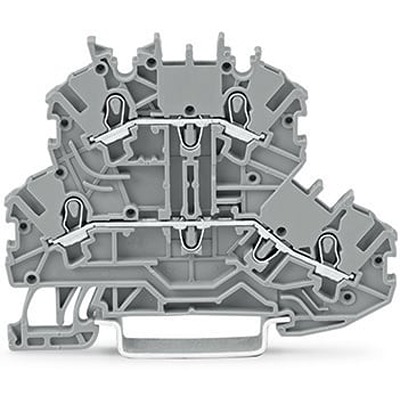 The WAGO Terminal block is a double deck terminal block. It is available in grey colour with through terminal block. This terminal block insulation is made from polyamide material and it has push in cage clamp connection technology. RoHS compliant 0.152 MJ fire load DIN 35 rail mounting V0 flammability class per UL94