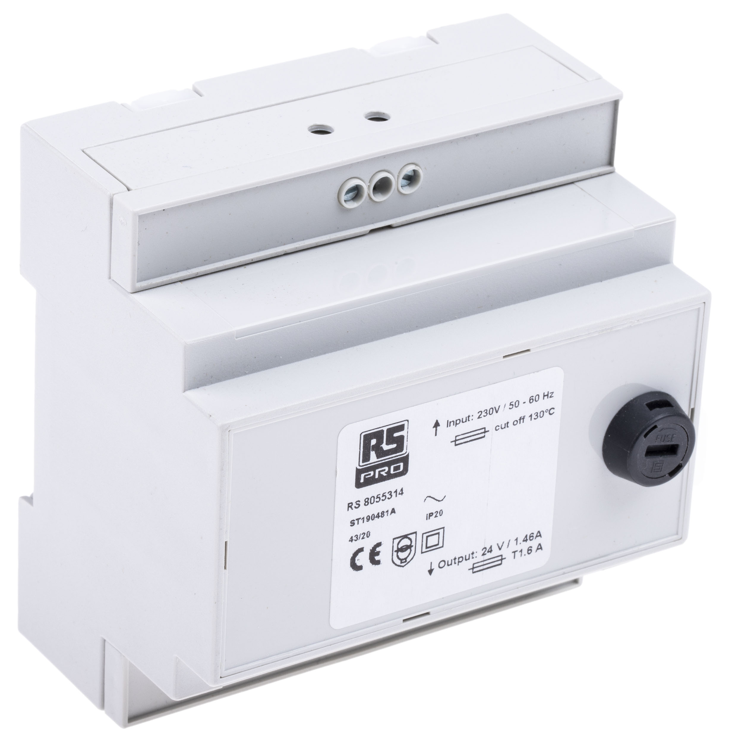 This is 35VA DIN Rail Transformer 230V ac Primary 1 x 24V ac Secondary manufactured by RS Pro. The manufacturer part number is 805-5314. Additionally, the product is supplied with 1 outputs. The product has +130°c maximum temperature. The given dimensions of the product include 88 x 58 x 90mm. The typical product's weight is 900g. It has about 230v ac primary voltage rating . Its accurate length is 90mm. It carries 60hz of maximum operating frequency. Furthermore, the product is 88mm wide. The product comes in 58mm depth. In addition, it has a secondary 24v ac voltage rating . It has a minimum 50hz operating frequency . The product is available in din rail configuration. Feature 35va of power rating. The product complies with all safety standards, such as iec 61558-2-6.