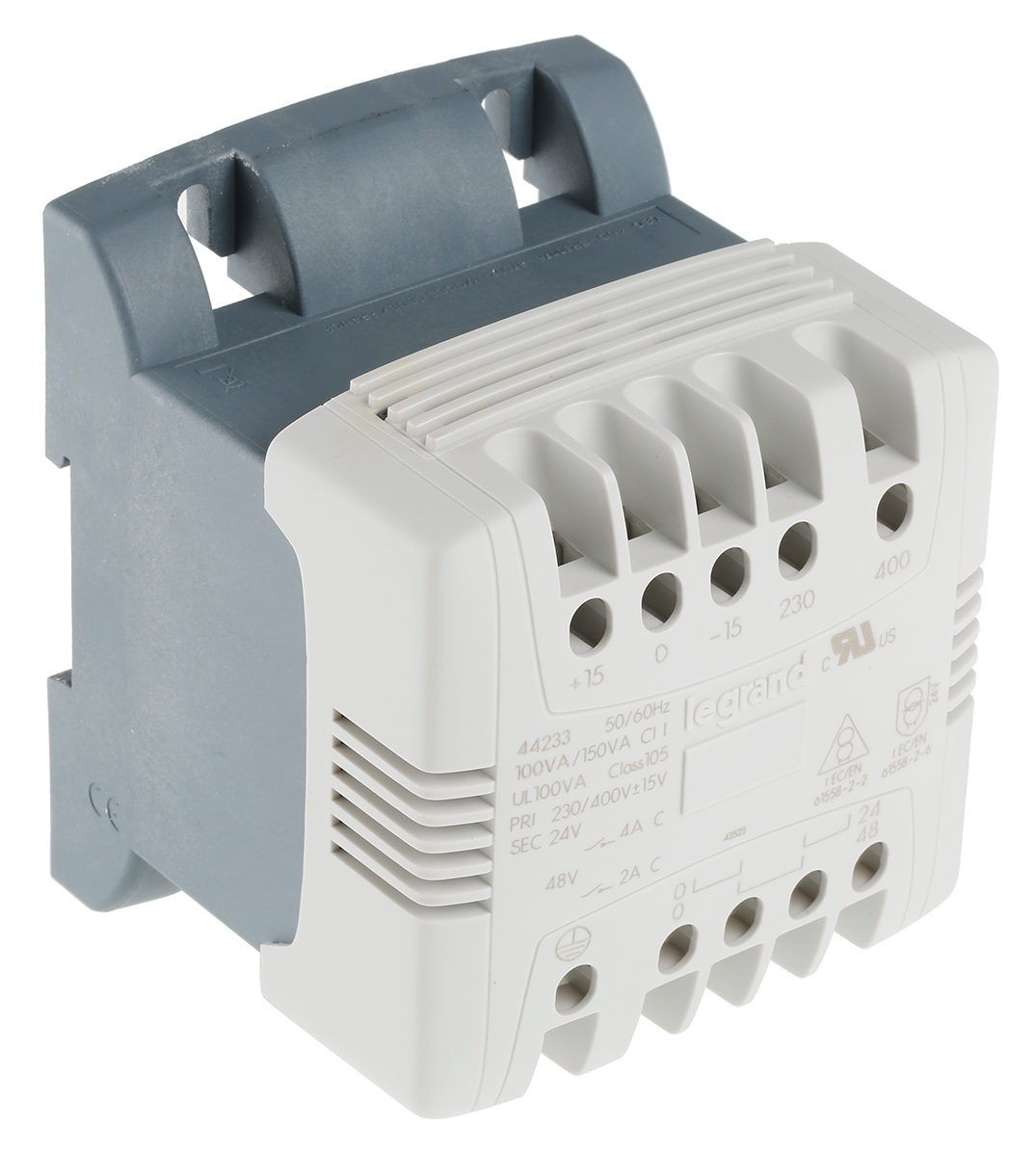 This is 100VA DIN Rail Transformer 230V ac 400V ac Primary 24V ac Secondary manufactured by Legrand. The manufacturer part number is 0 442 33. The product has +50°c maximum temperature. The given dimensions of the product include 113 x 94 x 94mm. The typical product's weight is 2kg. It has about 230v ac, 400v ac primary voltage rating . Its accurate length is 113mm. Furthermore, the product is 94mm wide. The product comes in 94mm depth. In addition, it has a secondary 24v ac voltage rating . The product is available in din rail configuration. Feature 100va of power rating.