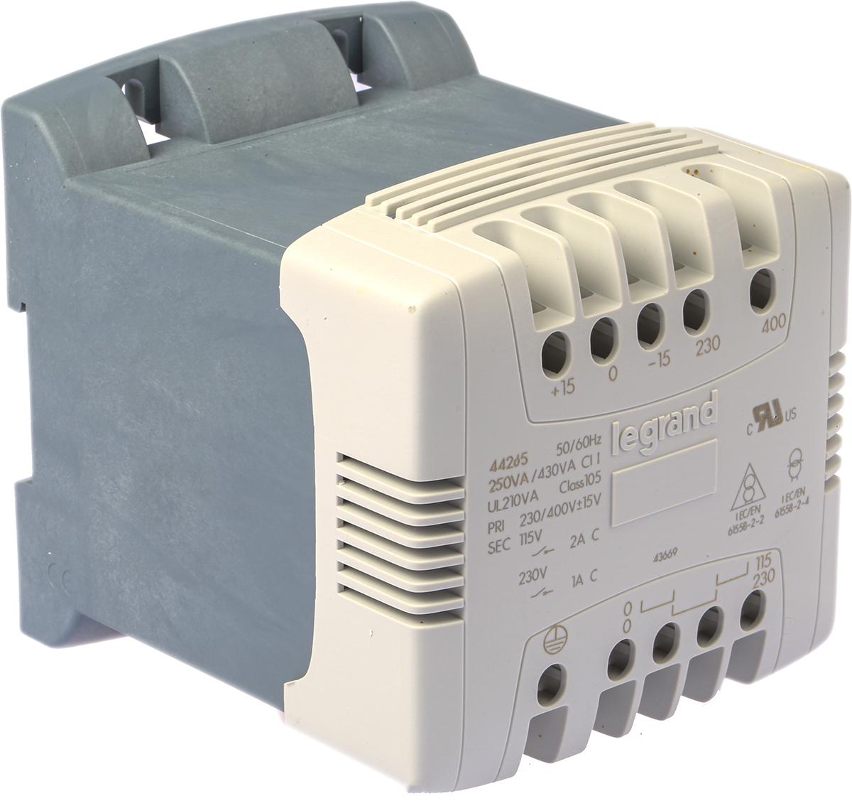 This is 250VA DIN Rail Transformer 215V ac 230V ac 245V ac 385V ac 400V ac 415V ac Primary 115V ac Secondary manufactured by Legrand. The manufacturer part number is 0 442 65. The product has +50°c maximum temperature. The given dimensions of the product include 115 x 106 x 123mm. The typical product's weight is 3.8kg. It has about 215v ac, 230v ac, 245v ac, 385v ac, 400v ac, 415v ac primary voltage rating . Its accurate length is 115mm. Furthermore, the product is 106mm wide. The product comes in 123mm depth. In addition, it has a secondary 115v ac voltage rating . The product is available in din rail configuration. Feature 250va of power rating.