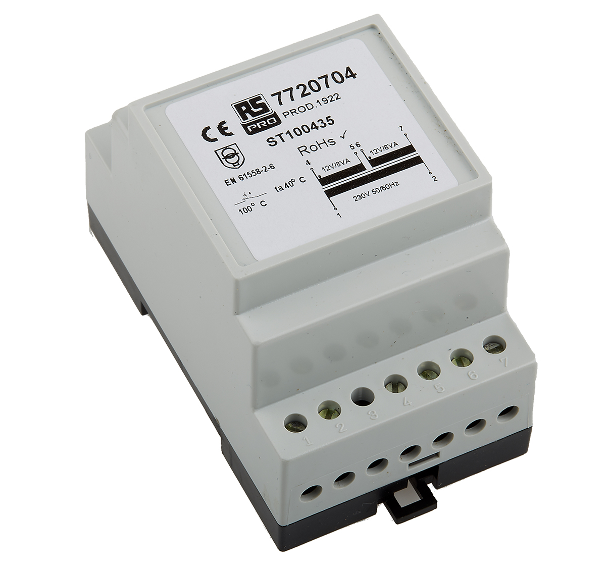 This is 16VA DIN Rail Mount Transformer 230V ac Primary 2 x 12V ac Secondary manufactured by RS Pro. The manufacturer part number is 772-0704. Additionally, the product is supplied with 2 outputs. The product has +130°c maximum temperature. The given dimensions of the product include 52.5 x 86 x 58mm. The product is available in din rail configuration. It has about 230v ac primary voltage rating . Its accurate length is 86mm. It carries 60hz of maximum operating frequency. Furthermore, the product is 52.5mm wide. The product comes in 58mm depth. In addition, it has a secondary 12v ac voltage rating . It has a minimum 50hz operating frequency . Feature 16va of power rating.