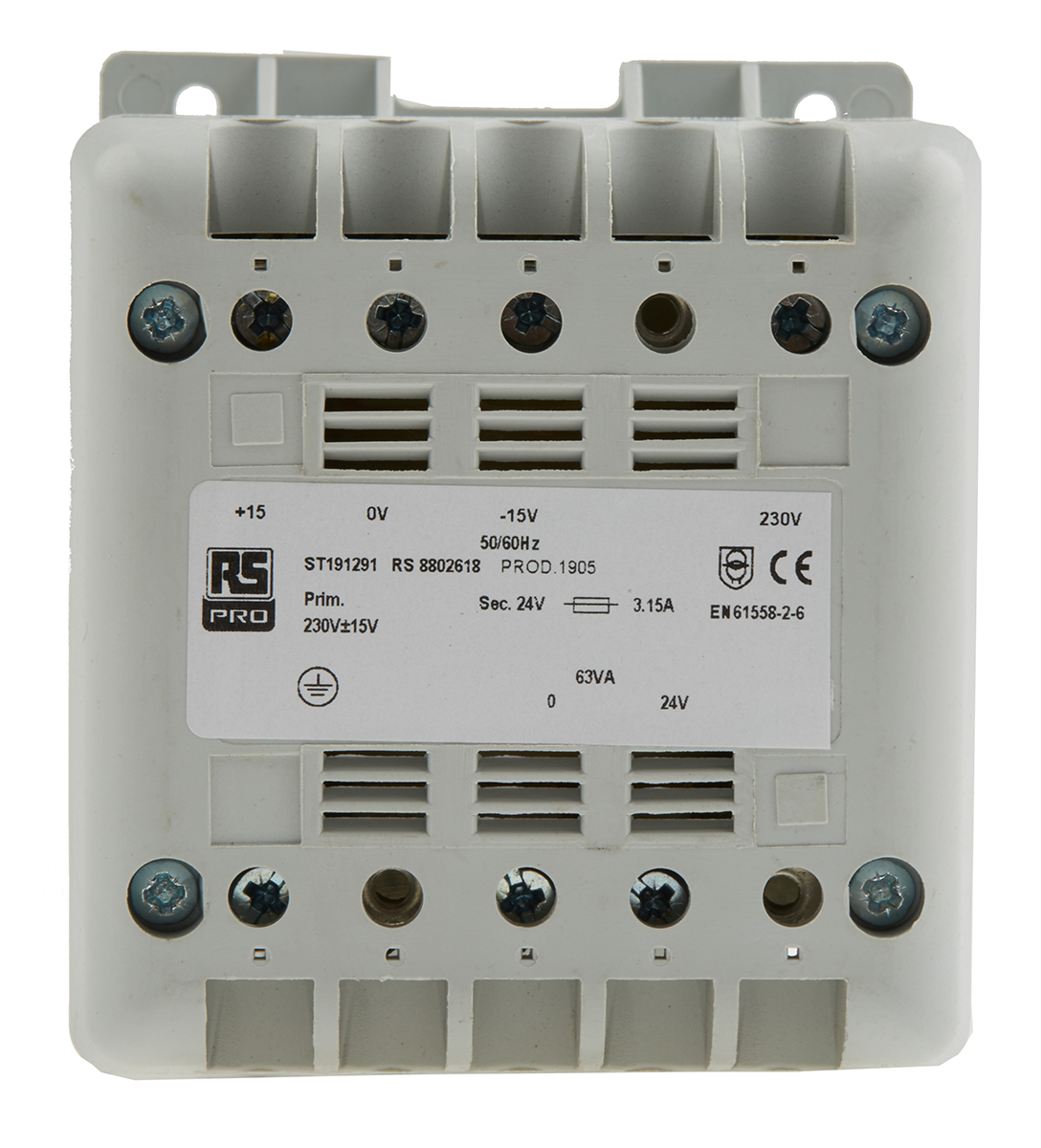 This is 63VA Panel Mount Transformer 230V ac Primary 24V ac Secondary manufactured by RS Pro. The manufacturer part number is 880-2618. The product has +130°c maximum temperature. The given dimensions of the product include 106 x 90 x 87mm. The typical product's weight is 1.5kg. It has about 230v ac primary voltage rating . Its accurate length is 106mm. It carries 60hz of maximum operating frequency. Furthermore, the product is 90mm wide. The product comes in 87mm depth. In addition, it has a secondary 24v ac voltage rating . It has a minimum 50hz operating frequency . The product is available in din rail configuration. Feature 63va of power rating. The product complies with all safety standards, such as iec 61558-2-6.