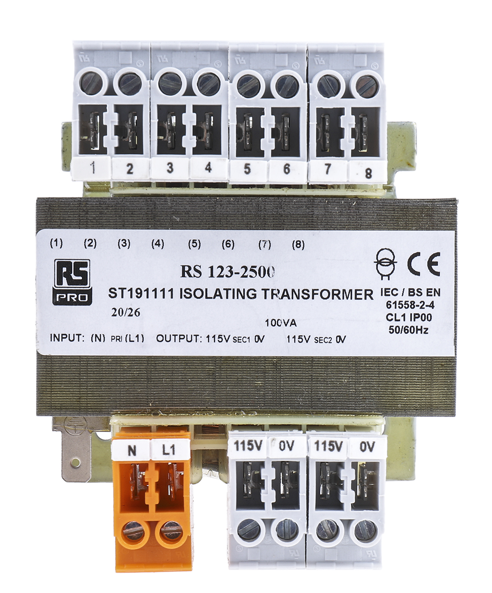 This is 100VA DIN Rail & Panel Mount Transformer manufactured by RS Pro. The manufacturer part number is 123-2500. The given dimensions of the product include 84 x 86 x 95mm. The typical product's weight is 2kg. It has about 208 v ac, 230 v ac, 380 v ac, 400 v ac, 415 v ac, 440 v ac, 460 v ac, 480 v ac, 500 v ac, 525 v ac, 550 v ac, 575 v ac, 600v ac primary voltage rating . Its accurate length is 84mm. It carries 60hz of maximum operating frequency. Furthermore, the product is 86mm wide. The product comes in 95mm depth. In addition, it has a secondary 2 x 115v voltage rating . It has a minimum 50hz operating frequency . The product is available in din rail configuration. Feature 100va of power rating.