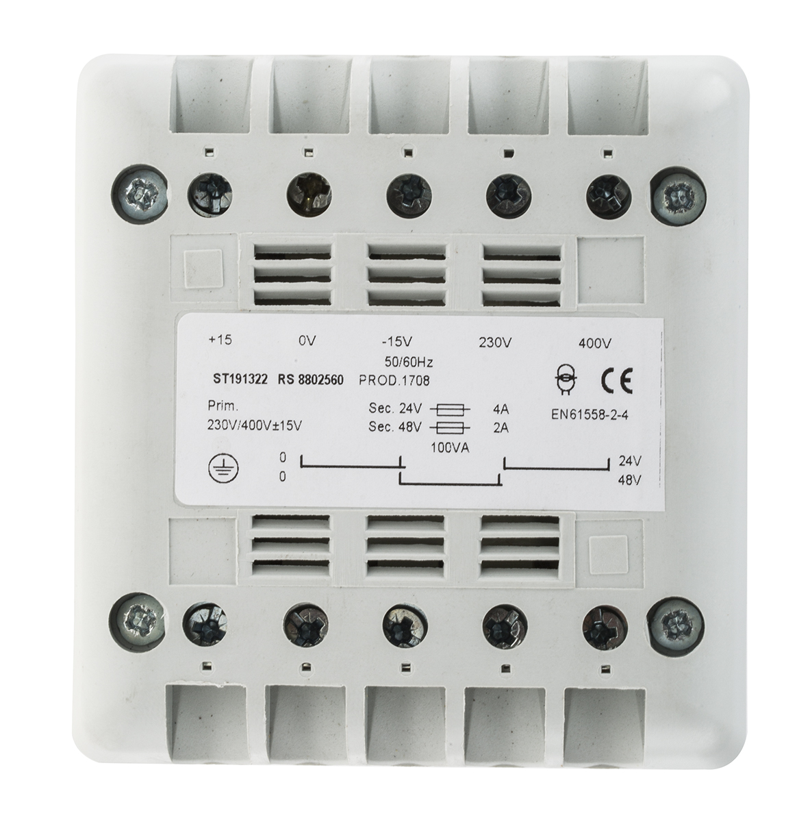 This is 100VA DIN Rail Mount Transformer 400V ac Primary 24V ac Secondary manufactured by RS Pro. The manufacturer part number is 880-2560. The product has +130°c maximum temperature. The given dimensions of the product include 106 x 90 x 107mm. The typical product's weight is 2.3kg. It has about 400v ac primary voltage rating . Its accurate length is 106mm. It carries 60hz of maximum operating frequency. Furthermore, the product is 90mm wide. The product comes in 107mm depth. In addition, it has a secondary 24v ac voltage rating . It has a minimum 50hz operating frequency . The product is available in din rail configuration. Feature 100va of power rating.