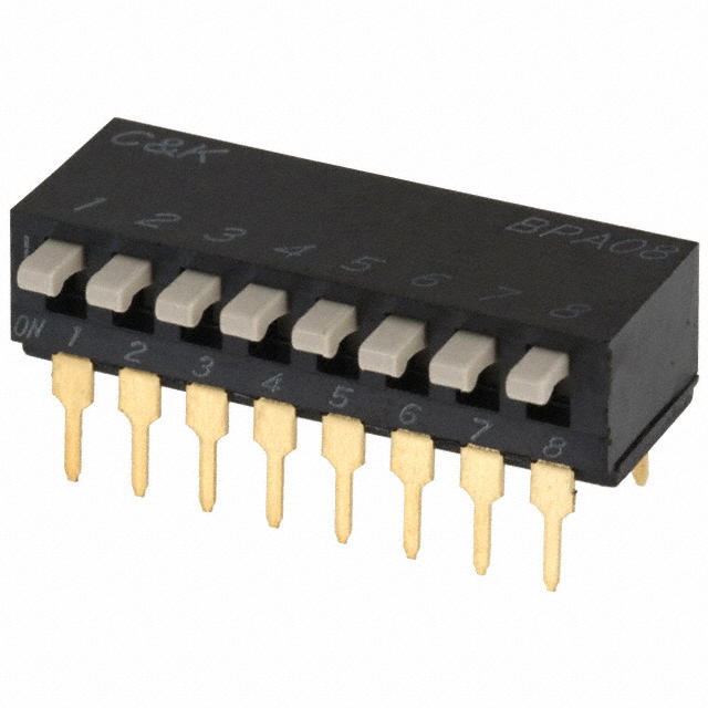 This is manufactured by C&K. The manufacturer part number is BPA08B. Whereas, the minimum operating temperature of the product is -20°c. The product is available in through hole configuration. The product has -20 → +85°c of operating temperature range. The rated contact current is 25 ma@ 24 v dc. Its package is of dip style . The product carries possible position value of 8. The product carries side actuator. The product also provide mechanical stability with 1000cycles. The contact is equipped with spst configuration. It has a maximum operating temperature of +85°c. The product is made from sturdy gold over nickel plated copper beryllium materials. Washable - yes. It is assigned with possible HTSUS value of 8536.50.9065. The product is rohs3 compliant. The product offers long-lasting services of 1,000 cycles. Moreover, it has pc pin terminal style. The product has -20°c ~ 85°c operating temperature range. It is 0.287" (7.30mm) high above board. The product also provide mechanical stability with 1,000 cycles. Features a raised actuator level. In addition, it is reach unaffected. The c&k's product offers user-desired applications. Moreover, the product has a nominal 5vdc voltage rating. Furthermore, the product is galvanized with excellent gold contact finishing. Its typical moisture sensitivity level is 1 (unlimited). Its accurate length is 0.878" (22.30mm). It has an integral spst circuit. It has a long 19 weeks standard lead time. Additionally, the product's output is 100ma. The product is available in through hole, right angle configuration. The product bpa, is a highly preferred choice for users. The product's body is nicely designed from polyphenylene sulfide (pps) materials. In addition, tube is the available packaging type of the product. The product carries piano actuator. Moreover, the product is 0.100" (2.54mm), full. The product is made from sturdy beryllium copper materials. The product is designated with the ear99 code number.