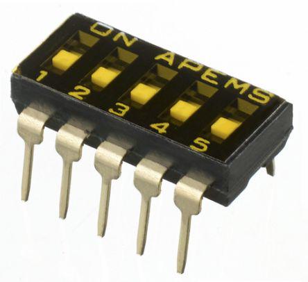 This is 5 Way Through Hole DIP Switch 5PST Recessed Top Side Lever Actuator manufactured by APEM. The manufacturer part number is IKD050000. Whereas, the minimum operating temperature of the product is -20°c. The product is available in through hole configuration. Moreover, the product has a nominal 24v dc voltage rating. The rated contact current is 25 ma. Its package is of dip style . The product has -20 → +85°c of operating temperature range. In addition, the product has 500v ac dielectric strength . The contact is equipped with 5pst configuration. The product carries recessed, top side lever actuator. It has a maximum operating temperature of +85°c. The product carries possible position value of 5. The product is made from sturdy phosphor bronze gold plated materials.