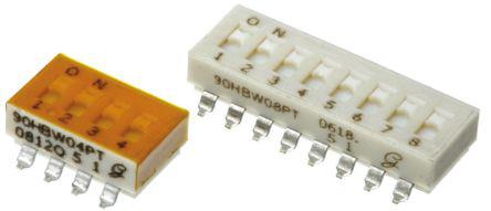 This is 4 Way Surface Mount DIP Switch SPST manufactured by Grayhill. The manufacturer part number is 90HBW04PT. Whereas, the minimum operating temperature of the product is -40°c. The product is available in surface mount configuration. The product has -40 → +85°c of operating temperature range. The rated contact current is 100 ma@ 6 v dc. Its package is of dip style . The contact is equipped with spst configuration. The product carries slide actuator. The product also provide mechanical stability with 2000operations. It has a maximum operating temperature of +85°c. The product carries possible position value of 4. The product is made from sturdy gold plated copper alloy materials.