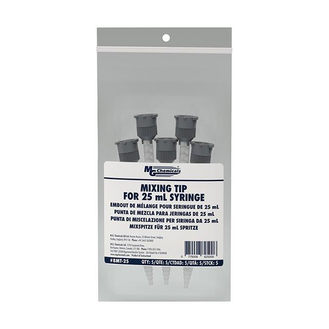 This is manufactured by MG Chemicals. The manufacturer part number is 8MT-25. The product consists of 1 pieces. It is assigned with possible HTSUS value of 3926.90.9989. The product is rohs3 compliant. In addition, it is reach unaffected. Its typical moisture sensitivity level is not applicable. In addition, bulk is the available packaging type of the product. It has a long 2 weeks standard lead time. The mg chemicals's product offers user-desired applications. It comes in static mixing nozzle configuration. The built-in exquisite tip is a tapered tip. The product is designated with the ear99 code number.