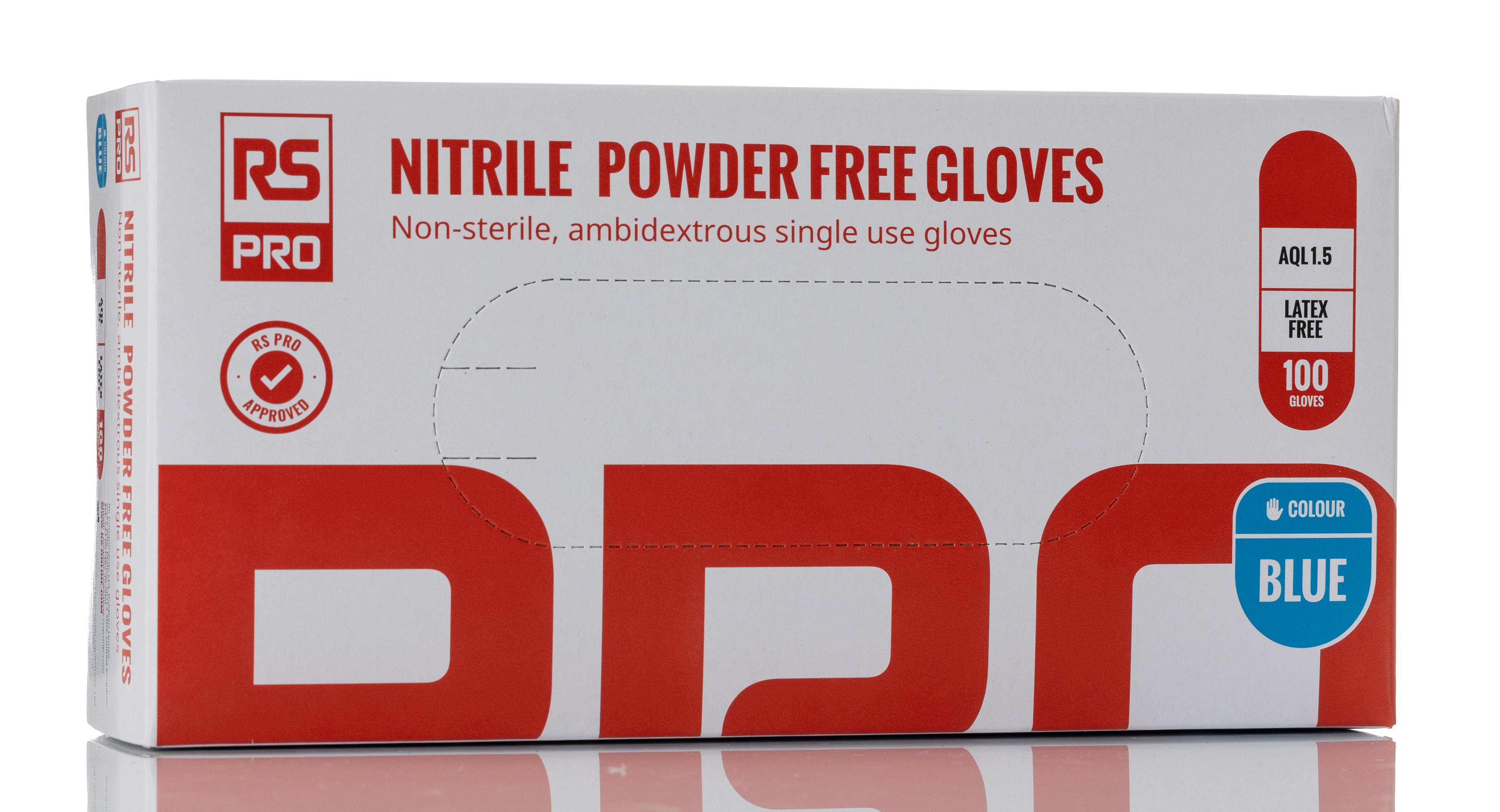 This is Blue Nitrile Gloves size 7.5 - M Powder-Free x 100 manufactured by RS Pro. The manufacturer part number is 124-2032. Additionally, its glove is made using nitrile material . It includes a chemical resistant type glove . It includes 100 gloves . It has a decent blue colour. It is complies with en374, en455 European safety standard . It is powder-free . It is food safe yes . The glove has a 7.5, medium size. It has 1.5 accepted quality level AQL .