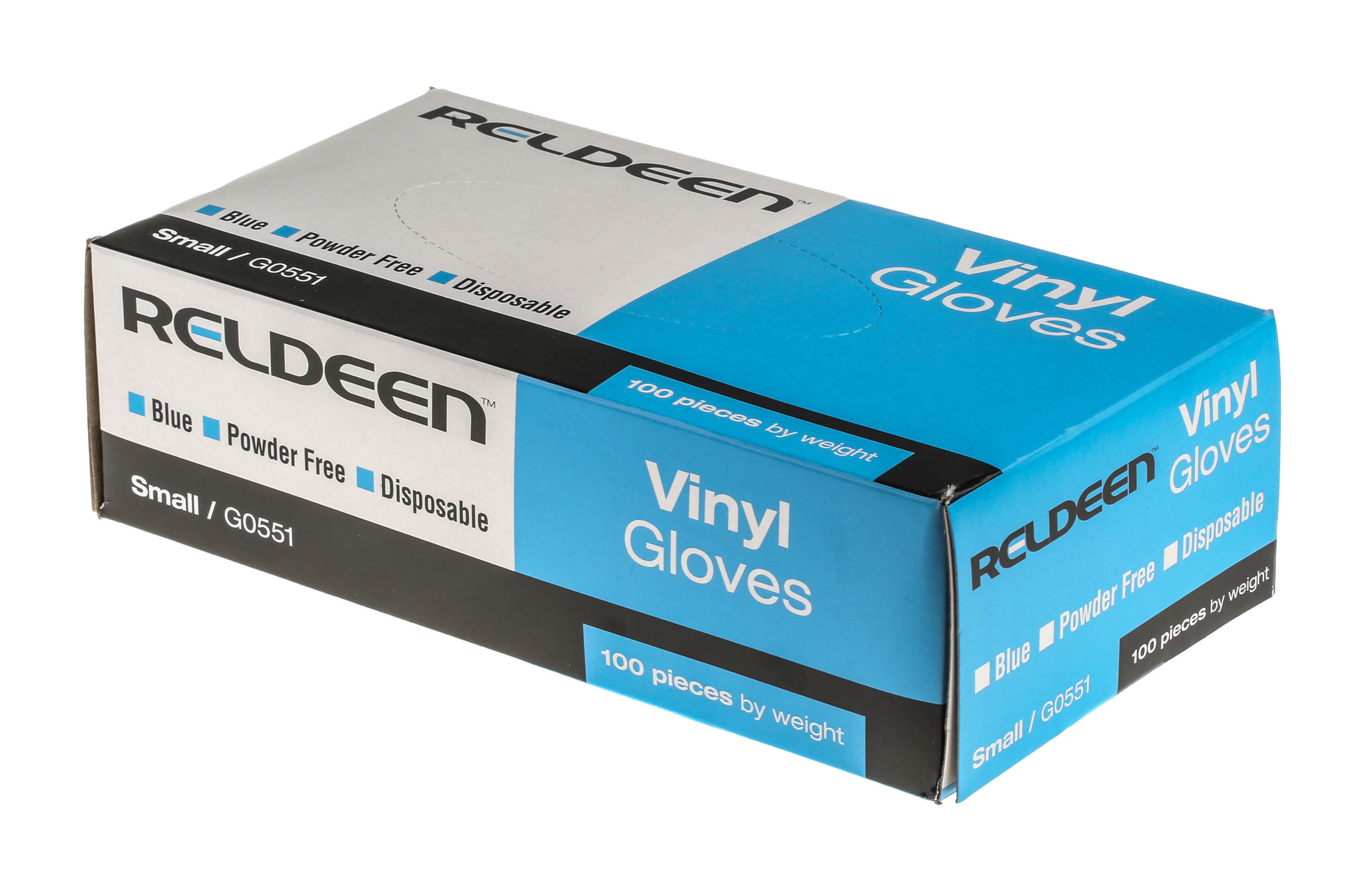 This is Blue Vinyl Disposable Gloves size 7 Small x 100 Powder-Free manufactured by Reldeen. The manufacturer part number is G0551. Additionally, its glove is made using vinyl material . It includes a minimal risk type glove . It includes 100 gloves . It has a decent blue colour. It is powder-free . It is food safe yes . The glove has a 7, small size.