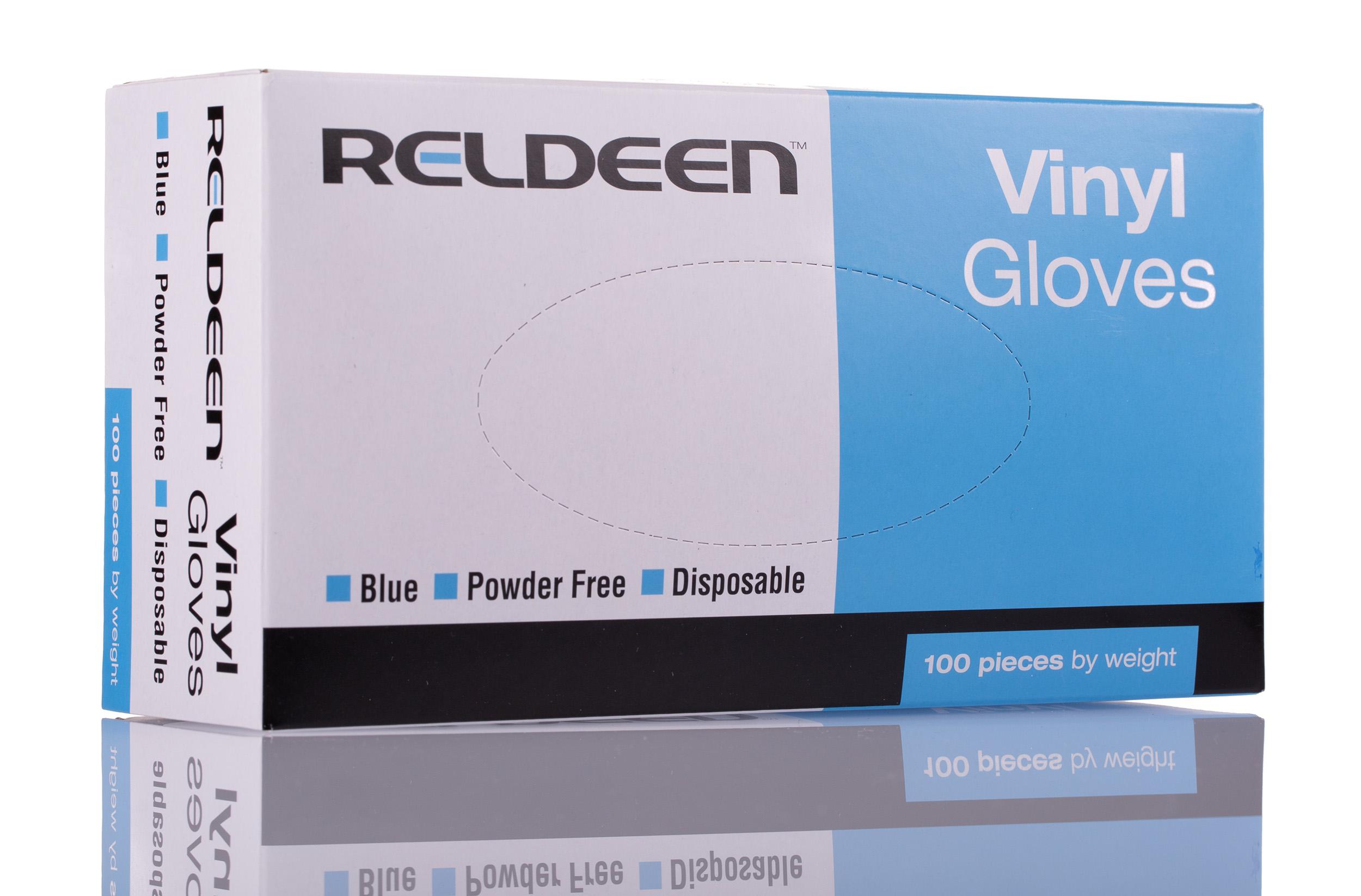 This is Blue Vinyl Disposable Gloves size 8 Medium x 100 Powder-Free manufactured by Reldeen. The manufacturer part number is G0552. Additionally, its glove is made using vinyl material . It includes a minimal risk type glove . It includes 100 gloves . It has a decent blue colour. It is powder-free . The glove has a 8, medium size.