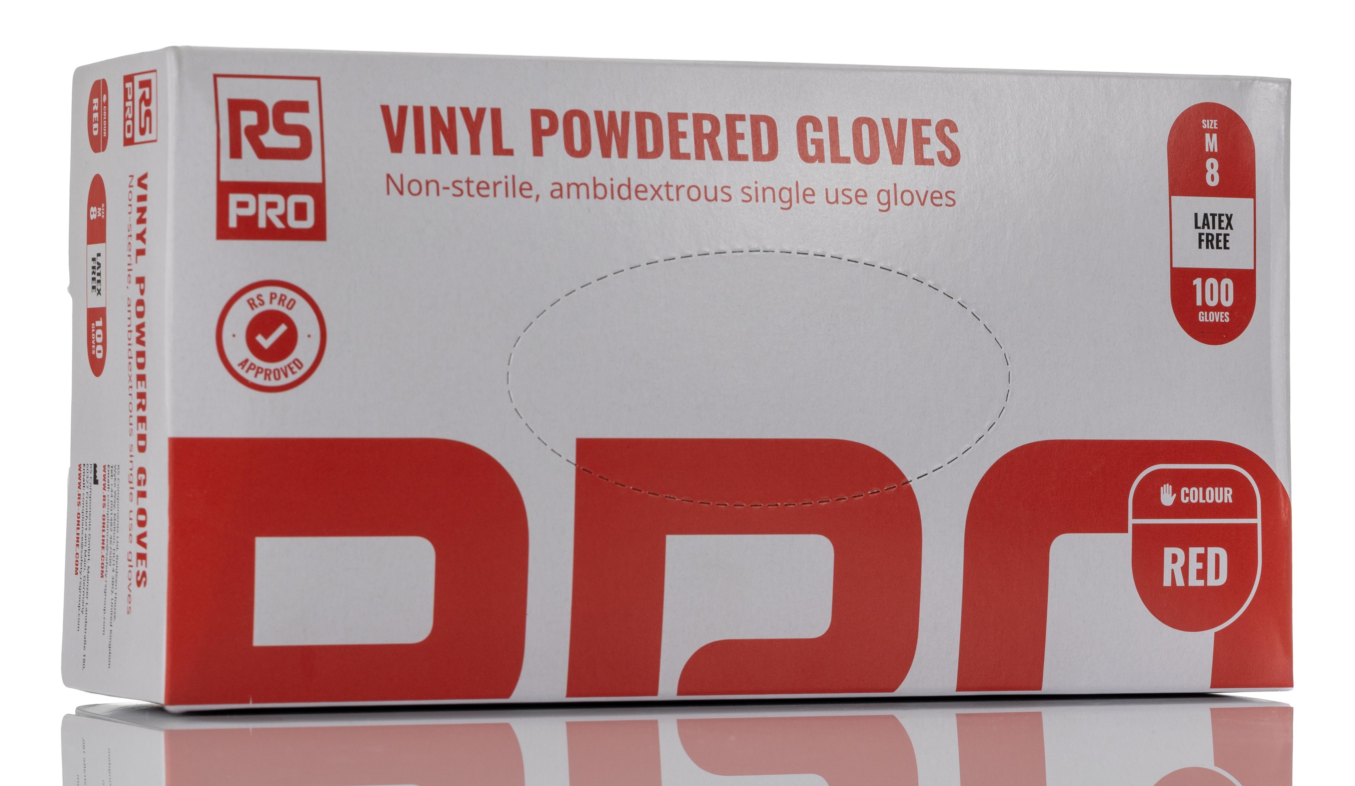 This is Red Powdered Vinyl Disposable Gloves Size M Food Safe 100 per Pack manufactured by RS PRO. The manufacturer part number is 245-8925. Additionally, its glove is made using vinyl material . It includes a minimal risk type glove . Anti-Static Options - no. It includes 100 gloves . It has a decent red colour. It is complies with en1186 European safety standard . It is pre-powdered . It is food safe yes . The glove has a m size.