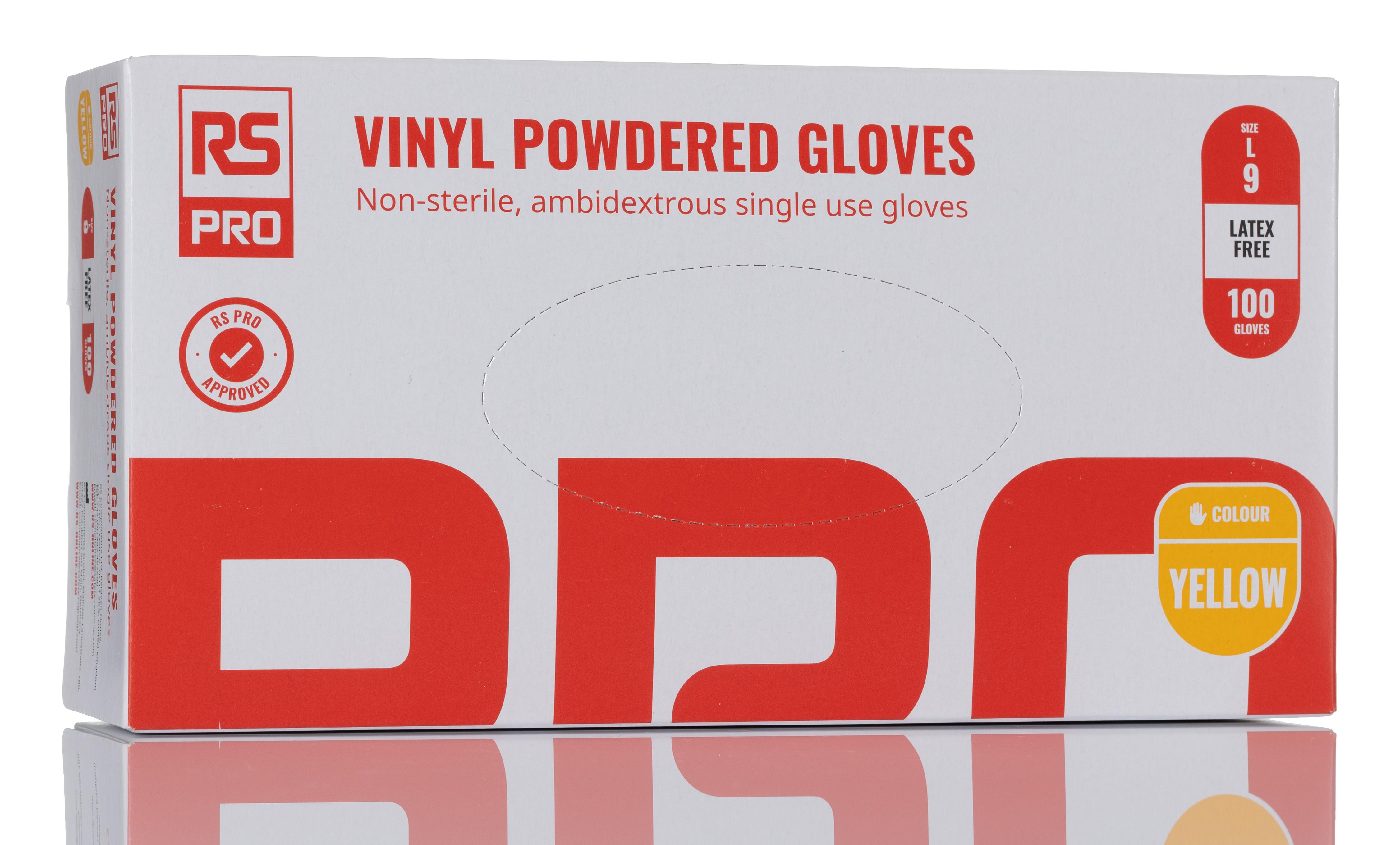 This is Yellow Powdered Vinyl Disposable Gloves Size L 100 per Pack manufactured by RS PRO. The manufacturer part number is 245-8932. Additionally, its glove is made using vinyl material . It includes a minimal risk type glove . It includes 100 gloves . It has a decent yellow colour. It is complies with en1186 European safety standard . It is pre-powdered . The glove has a l size.