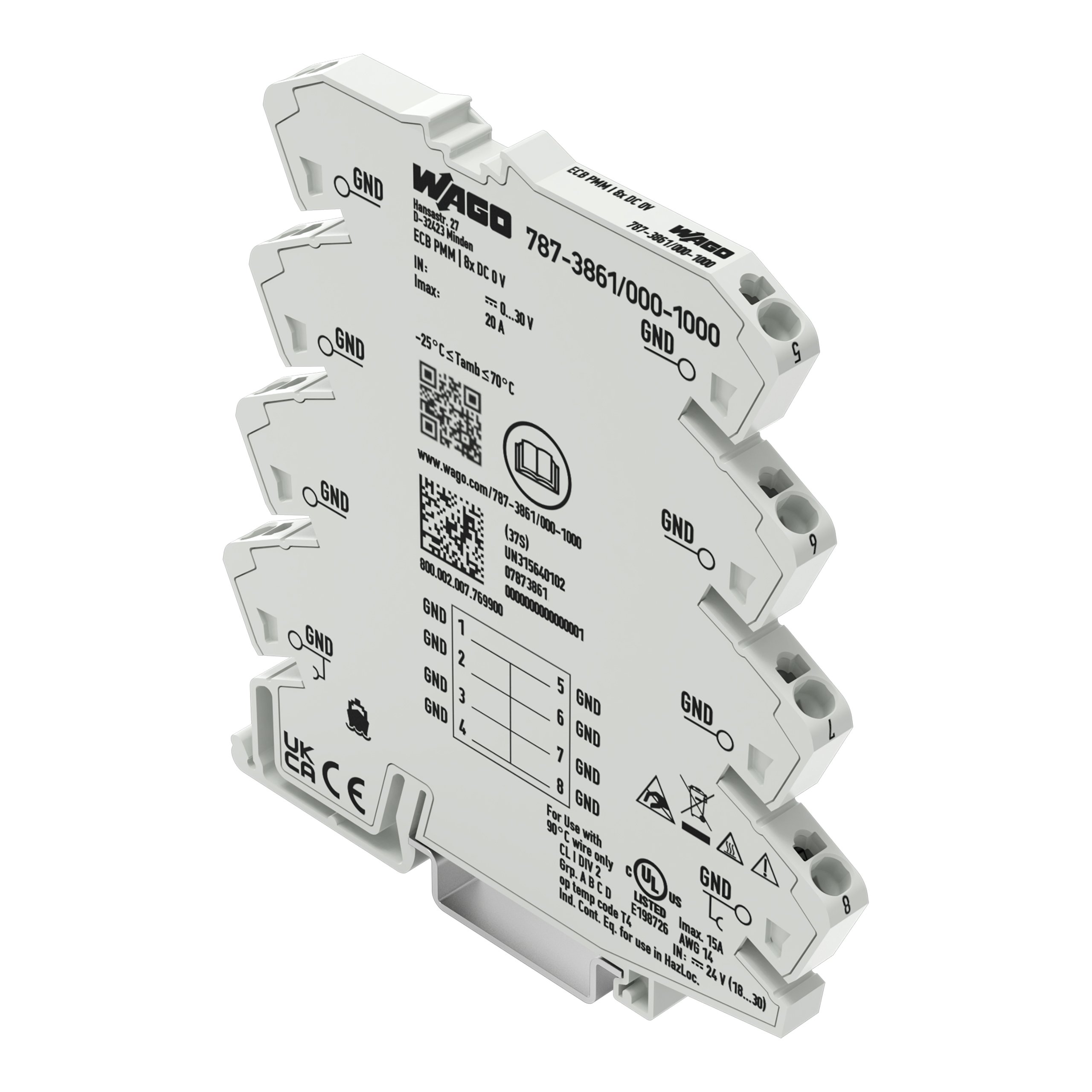 This is Distribution Block 8 Way 2.5mm² 20A 30 V dc White manufactured by WAGO. The manufacturer part number is 787-3861/000-1000. The product has a current rating of 20a. It is IP rated with ip20. It has a decent white colour. Moreover, the product has a nominal 30 v dc voltage rating. The product also features robust polyamide housing material. It comprises 8 ways. It allows push in termination method. The cross section area of the cable includes 2.5mm². Concerning wire's size, it is 14 awg.