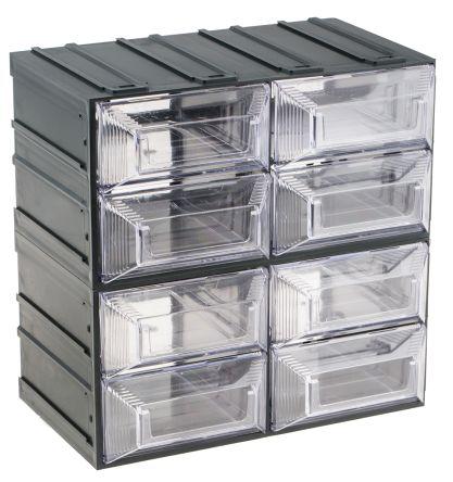 Interlocking Clear Unit Industrial quality manufactured from high impact plastic, designed with label and slot to the front. All cabinet sizes lock together with Dovetail slots to sides. Stock no. 399-1814 includes 4 drawers with 18 movable dividers and 8 fixed dividers.