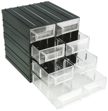 Interlocking Clear Unit Industrial quality manufactured from high impact plastic, designed with label and slot to the front. All cabinet sizes lock together with Dovetail slots to sides. Stock no. 399-1814 includes 4 drawers with 18 movable dividers and 8 fixed dividers.