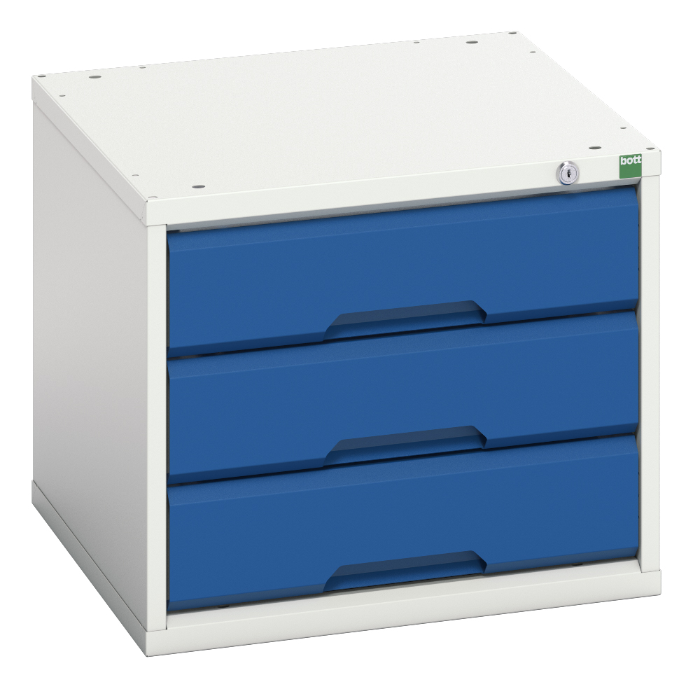 This is Cabinet Drawer Storage Unit 600mm x 525mm x 450mm manufactured by Bott. The manufacturer part number is 16925001.11. It includes 3 high quality drawers . It has a decent blue, grey colour. The casing is constructed from highly stable steel material. Its drawer material is steel . It includes tilt drawers no . Furthermore, the product is 525mm wide. The product comes in 550mm depth. In addition, it has transparent drawers no . In addition, the height is 450mm.