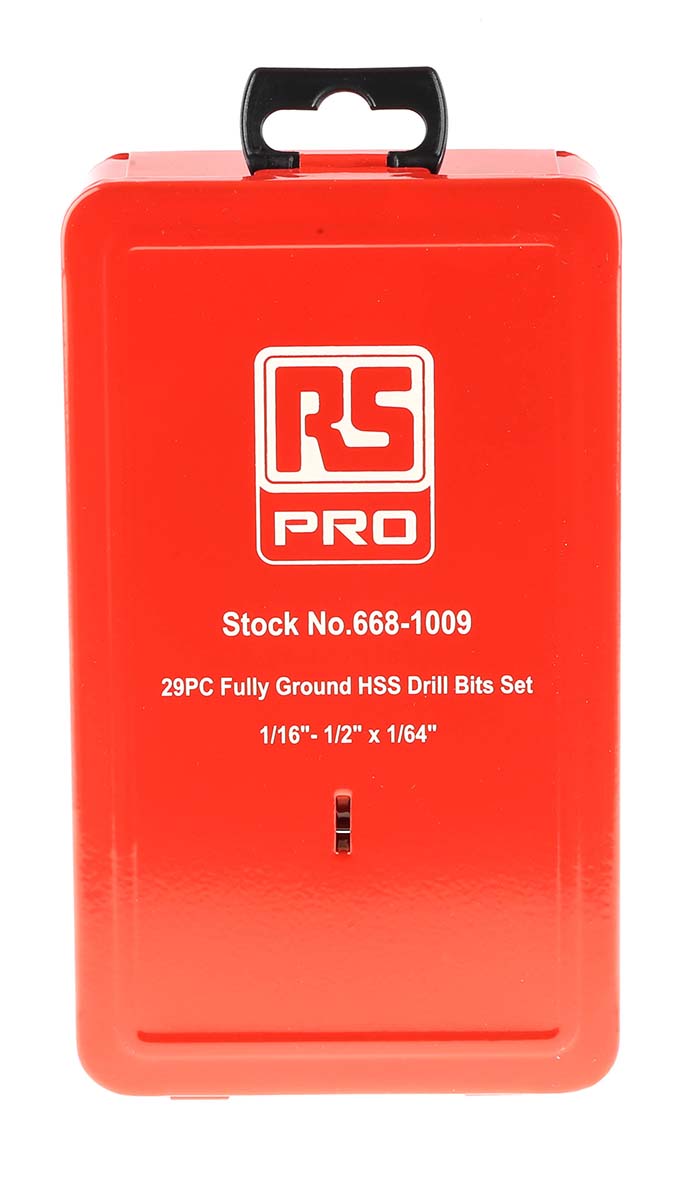 This is HSS-G 1/16in to 1/2in 29 piece Twist Drill Set manufactured by RS Pro. The manufacturer part number is 668-1009. Moreover, it has a minimum 1/16in size . The product is made from highly stable and reliable hss-g. It has a maximum 1/2in size . It is for metal drilling applications . It has a/an twist drill bit type drill bit . Moreover, it has hss drill bits set contents . The product consists of 29 pieces.