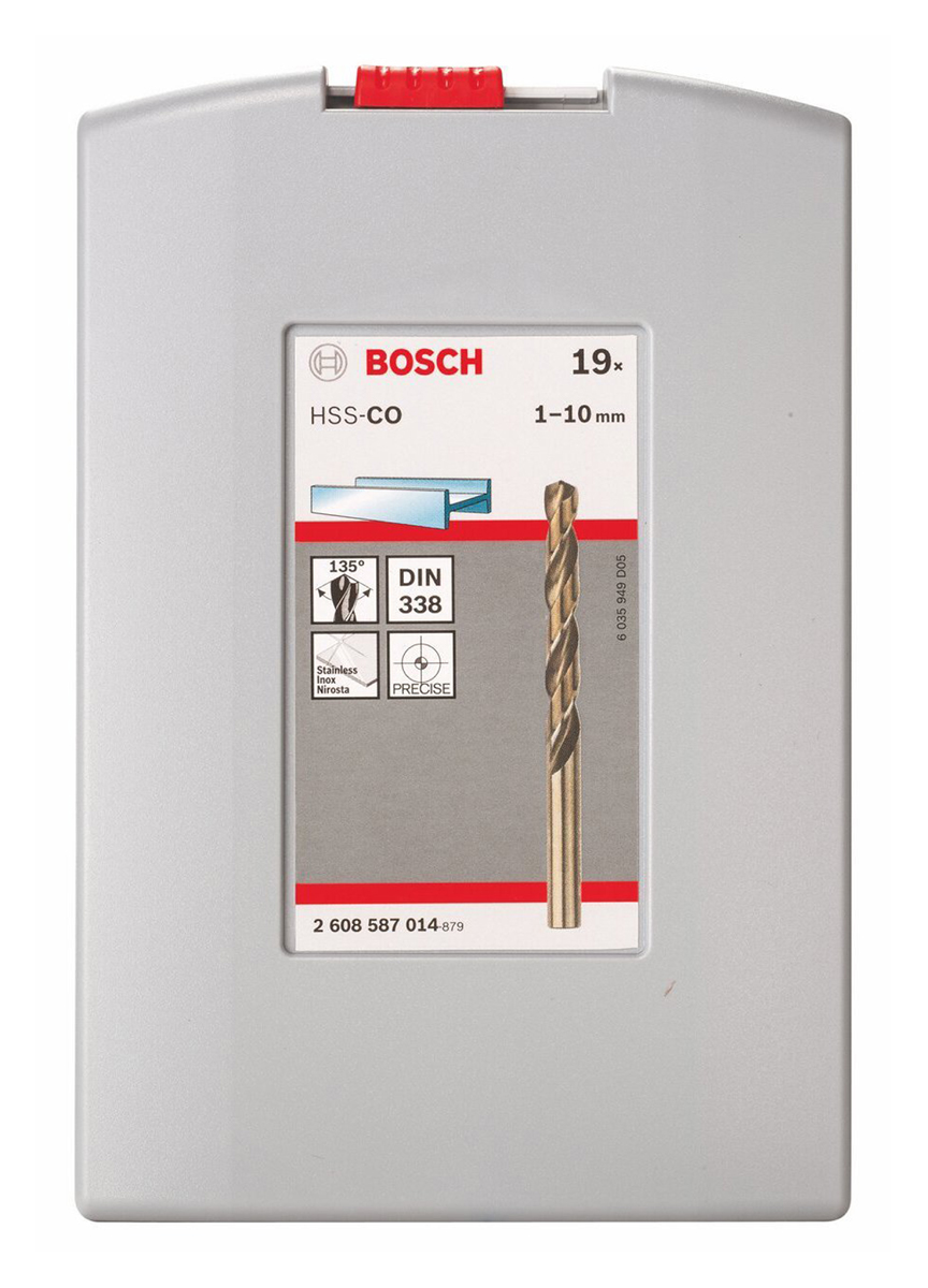 This is HSS-Co 1mm to 10mm 19 piece Drill Bit Set manufactured by Bosch. The manufacturer part number is 2608587014. Moreover, it has a minimum 1mm size . The product is made from highly stable and reliable hss-co. It has a maximum 10mm size . This is a type of hss twist drill bit, a set with user-desired tools. It is for metal drilling applications . It has a/an twist drill bit type drill bit . Moreover, it has hss drill bits set contents . The product consists of 19 pieces.