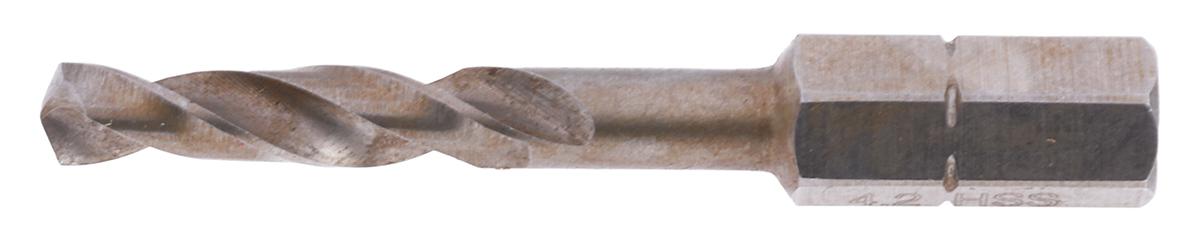 This is HSS 4.2mm Hexagon Drill Bit 45 mm Hex Shank manufactured by RS Pro. The manufacturer part number is 669-9375. It has a/an twist drill bit type drill bit . Its diameter is 4.2mm. The product is made from highly stable and reliable hss. It has an overall length of 45 mm.