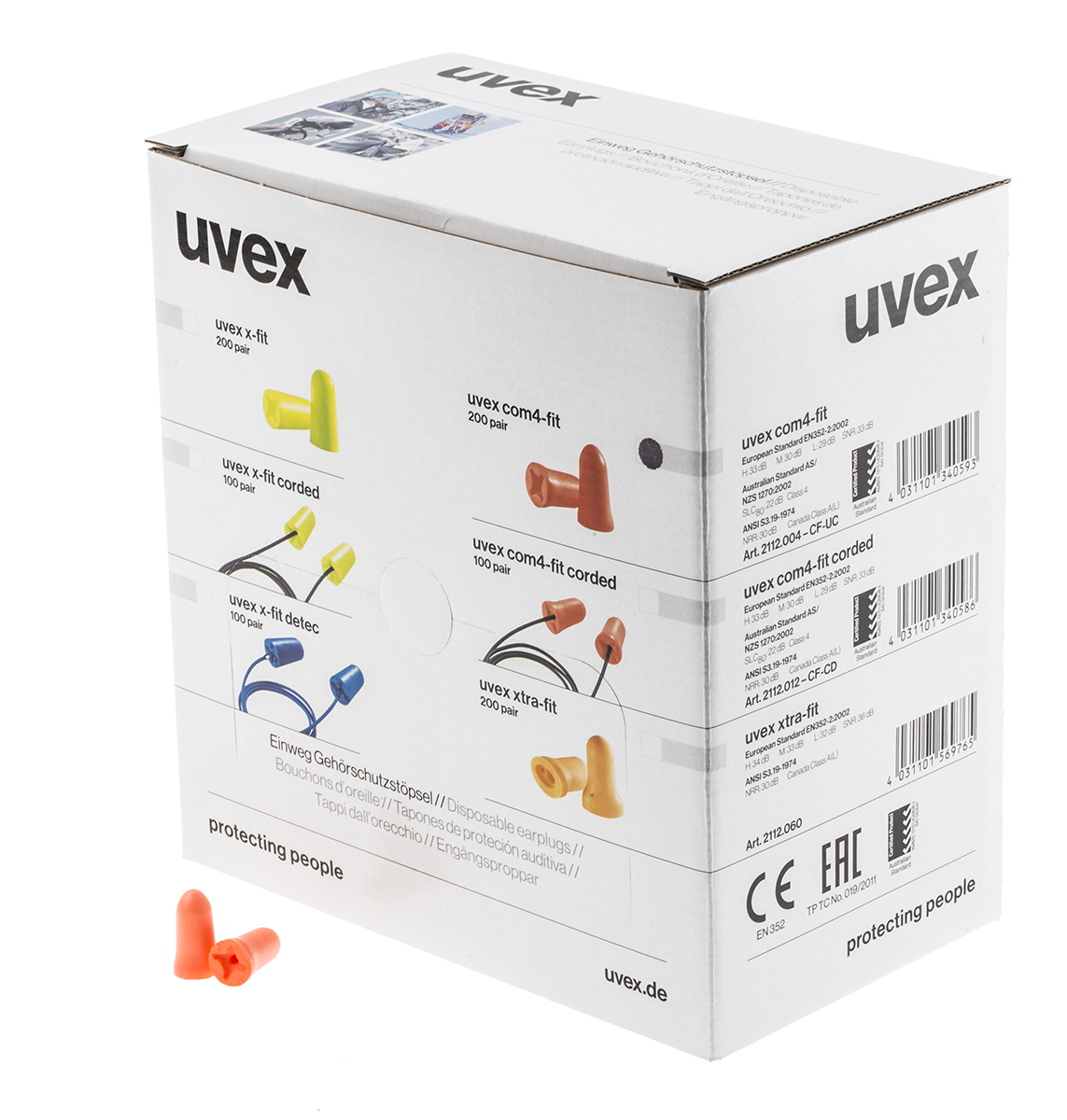 This is Disposable Orange Foam Ear Plugs 33dB 200 Pairs manufactured by Uvex. The manufacturer part number is 2112 004. The product complies with all safety standards, such as ce, en 352-2. The product has a/an uncorded style attachment . The product com4-fit, is a highly preferred choice for users. It has a decent orange colour. The product is made from highly stable and reliable polyurethane. It has 200 number of pairs per package . In addition, the product is disposable . It is metal detectable no . It has 33db single number rating SNR .