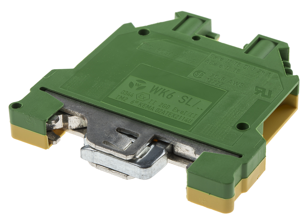 This is 2 Way Earth Terminal Block Screw Down 20 → 8 AWG 54mm Length Green/Yellow manufactured by RS Pro. The manufacturer part number is 384-7004. The product has a current rating of 41a. Moreover, the product has a nominal 800 v voltage rating. It has a decent green/yellow colour. In addition, the height is 61.5mm. The product also features robust nylon housing material. Furthermore, the product is 8mm wide. Its accurate length is 54mm. It comprises 2 ways. It allows screw down termination method. The cross section area of the cable includes 6mm². Concerning wire's size, it is 20 → 8 awg.