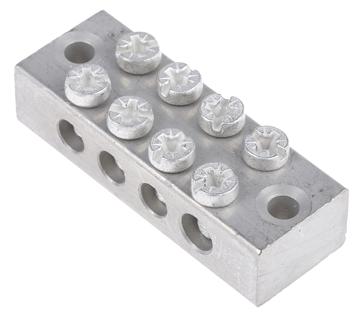 This is 4 Way Double Screw Earth Terminal Block Screw Down 0 → 16 mm² 50.8mm length Grey manufactured by RS Pro. The manufacturer part number is 425-544. It comprises 4 ways. It has a decent grey colour. In addition, the height is 12.2mm. The product also features robust brass housing material. Furthermore, the product is 18.5mm wide. Its accurate length is 51.4mm. It allows screw down termination method. The cross section area of the cable includes 0 to 16mm². Concerning wire's size, it is 0 → 16 awg. It has a double screw type earth block .