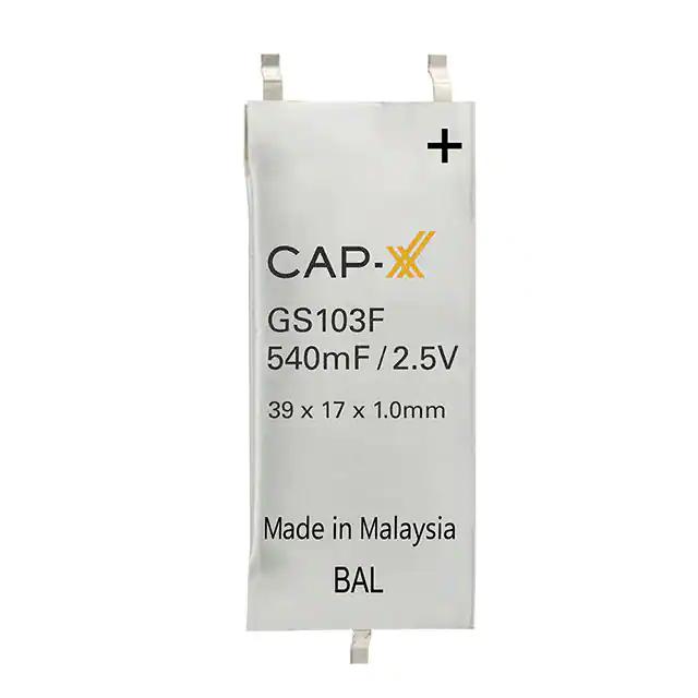 This is manufactured by CAP-XX Ltd Supercapacitors. The manufacturer part number is GS103F. It also exhibits voltage rating of 2.5 v. The product is rohs3 compliant. It carries ESR (Equivalent Series Resistance) of 24mohm. It provides a 540 mf of capacitance value. The product has -40°c ~ 70°c operating temperature range. Moreover, the product comes in 2-smd. It features ±20% of tolerance value. It has the maximum seated height of 0.043" (1.10mm). In addition, it is reach unaffected. It is shipped in bulk package . The product's diameters include 1.535" l x 0.669" w (39.00mm x 17.00mm). The product is available in surface mount configuration.