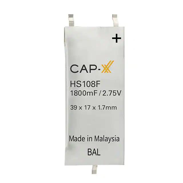 This is manufactured by CAP-XX Ltd Supercapacitors. The manufacturer part number is HS108F. It also exhibits voltage rating of 2.75 v. The product is rohs3 compliant. It carries ESR (Equivalent Series Resistance) of 30mohm. It provides a 1.8 f of capacitance value. The product has -40°c ~ 85°c operating temperature range. Moreover, the product comes in 2-smd. It features ±20% of tolerance value. It has the maximum seated height of 0.067" (1.70mm). In addition, it is reach unaffected. It is shipped in bulk package . The product's diameters include 1.535" l x 0.669" w (39.00mm x 17.00mm). The product is available in surface mount configuration.