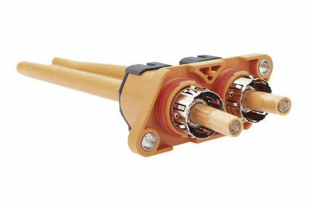 This is Electric vehicle connector Plug 250A manufactured by Amphenol. The manufacturer part number is HVPTB2B50. Concerning wire's size, it is 50 mm². The product has a current rating of 250a. The product has a straight orientation. The product is available in panel mount configuration. It has a maximum operating temperature of +125°c. It has a decent orange colour. It allows crimp termination method. This female contact is widely suited for specific applications. The key is a b key with exquisite design. Furthermore, the product is 55mm wide. The product comes in 38mm depth. It comes in 1 of rows. Whereas, the minimum operating temperature of the product is -40°c. The product contains 2 contacts. The pin has 22mm caliber. In addition, the height is 87mm. The connector is of male gender .