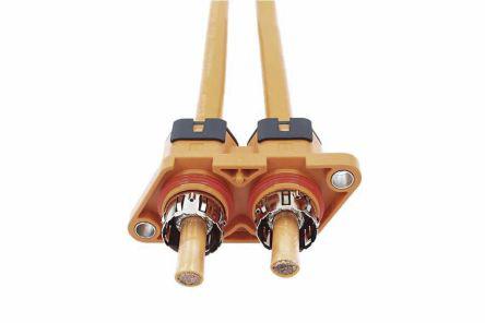 This is Electric vehicle connector Plug 250A manufactured by Amphenol. The manufacturer part number is HVPTB3N50. Concerning wire's size, it is 50 mm². The product has a current rating of 250a. The product has a straight orientation. The product is available in panel mount configuration. It has a maximum operating temperature of +125°c. It has a decent orange colour. It allows crimp termination method. This female contact is widely suited for specific applications. The key is a n key with exquisite design. Furthermore, the product is 55mm wide. The product comes in 38mm depth. It comes in 1 of rows. Whereas, the minimum operating temperature of the product is -40°c. The product contains 3 contacts. The pin has 22mm caliber. In addition, the height is 87mm. The connector is of male gender .