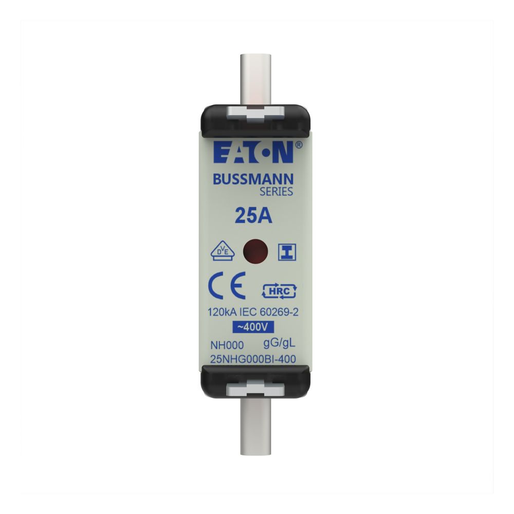 This is manufactured by Eaton. The manufacturer part number is 25NHG000BI-400. Moreover, the product has a nominal 400v ac voltage rating. A fuse with a 51 x 21 x 79mm size. The product has a current rating of 25a. The fuse complies with gl/gg standards. It has typical 5 weeks of manufacturer standard lead time. The product's diameters include 2.126" l x 0.827" w x 1.693" h (54.00mm x 21.00mm x 43.00mm). The splendid features of the product include indicating. The product is available in holder configuration. The product exhibits 400v of AC voltage rating. The product complies with ce, vde. It is available in the standard package of 3. Its typical moisture sensitivity level is 1 (unlimited). In addition, bulk is the available packaging type of the product. The product is widely employed in industrial, motor protection, solar (photovoltaic). It has a 920 melting I²t. It integrates a square fuse type. Moreover, the product comes in rectangular, blade. Whereas, the breaking capacity of the product at rated voltage is 120ka. Class Information: nh. The eaton's product offers user-desired applications.