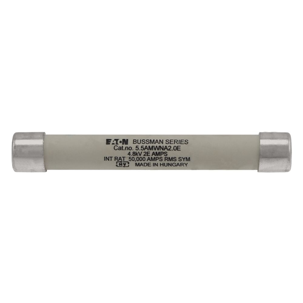 This is manufactured by Eaton. The manufacturer part number is 5.5AMWNA2.0E. A fuse with a 142 x 20.6mm size. The product has a current rating of 2a. Moreover, the product has a nominal 5.5kv voltage rating. It has typical 6 weeks of manufacturer standard lead time. The product's diameters include 0.811" dia x 5.591" l (20.60mm x 142.00mm). The product is available in holder configuration. It is available in the standard package of 5. In addition, bulk is the available packaging type of the product. Its typical moisture sensitivity level is 1 (unlimited). Moreover, the product comes in fuse link. Alternative Names include 5-5amwna2-0e. The eaton's product offers user-desired applications.