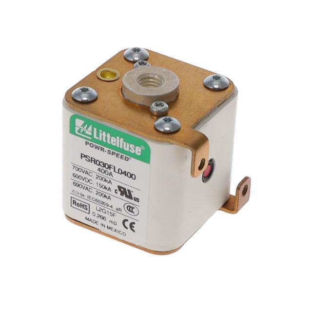 This is manufactured by Littelfuse Inc.. The manufacturer part number is PSR030FL0400Z. It is assigned with possible HTSUS value of 8536.10.0040. The product is rohs3 compliant. Whereas, the breaking capacity of the product at rated voltage is 200ka ac, 150ka dc. 600 vdc of DC voltage rating. The product has -55°c ~ 125°c operating temperature range. It is approved by ccc, ce, curus, ul. The product exhibits 700 vac of AC voltage rating. In addition, it is reach unaffected. The product is widely employed in semiconductors. It has a 16209.0 melting I²t. It responds within fast blow. The littelfuse inc.'s product offers user-desired applications. The product's diameters include 1.969" l x 1.693" w x 1.929" h (50.00mm x 43.00mm x 49.00mm). It has a long 15 weeks standard lead time. Additionally, the product's output is 400a. Its typical moisture sensitivity level is not applicable. The product is available in bolt mount configuration. The product powr-speed® psr, is a highly preferred choice for users. In addition, bulk is the available packaging type of the product. It integrates a square fuse type. The product is designated with the ear99 code number.
