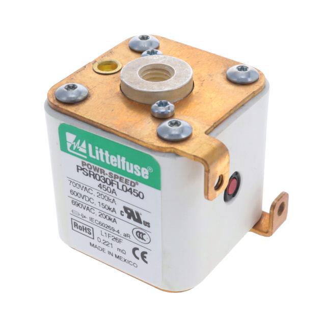 This is manufactured by Littelfuse Inc.. The manufacturer part number is PSR030FL0450Z. It is assigned with possible HTSUS value of 8536.10.0040. The product is rohs3 compliant. Whereas, the breaking capacity of the product at rated voltage is 200ka ac, 150ka dc. 600 vdc of DC voltage rating. The product has -55°c ~ 125°c operating temperature range. It is approved by ccc, ce, curus, ul. The product exhibits 700 vac of AC voltage rating. In addition, it is reach unaffected. The product is widely employed in semiconductors. It has a 23133 melting I²t. It responds within fast blow. It is shipped in bulk package . The product's diameters include 1.969" l x 1.693" w x 1.929" h (50.00mm x 43.00mm x 49.00mm). It has a long 10 weeks standard lead time. Additionally, the product's output is 450a. Its typical moisture sensitivity level is not applicable. The product is available in bolt mount configuration. The product powr-speed® psr, is a highly preferred choice for users. It integrates a square fuse type. The product is designated with the ear99 code number.