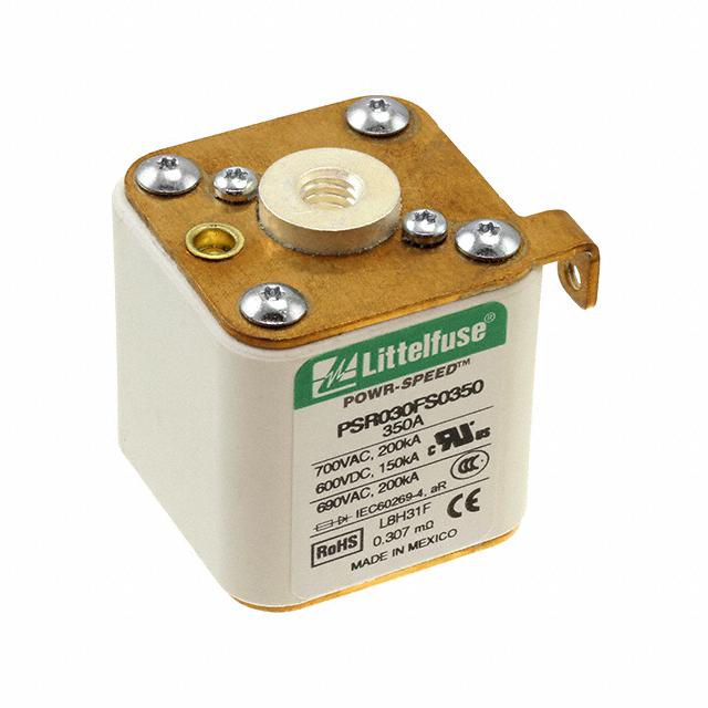 This is manufactured by Littelfuse Inc.. The manufacturer part number is PSR030FS0350Z. It is assigned with possible HTSUS value of 8536.10.0040. The product is rohs3 compliant. Whereas, the breaking capacity of the product at rated voltage is 200ka ac, 150ka dc. 600 vdc of DC voltage rating. The product has -55°c ~ 125°c operating temperature range. It is approved by ccc, ce, curus, ul. The product exhibits 700 vac of AC voltage rating. In addition, it is reach unaffected. The product is widely employed in semiconductors. It has a 12007.0 melting I²t. It responds within fast blow. The littelfuse inc.'s product offers user-desired applications. The product's diameters include 1.969" l x 1.693" w x 1.929" h (50.00mm x 43.00mm x 49.00mm). It has a long 30 weeks standard lead time. Additionally, the product's output is 350a. Its typical moisture sensitivity level is not applicable. The product is available in bolt mount configuration. The product powr-speed® psr, is a highly preferred choice for users. In addition, bulk is the available packaging type of the product. It integrates a square fuse type. The product is designated with the ear99 code number.