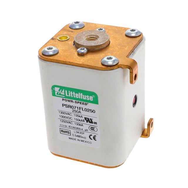This is manufactured by Littelfuse Inc.. The manufacturer part number is PSR071FL0250Z. It is assigned with possible HTSUS value of 8535.10.0040. The product is rohs3 compliant. Whereas, the breaking capacity of the product at rated voltage is 100ka ac, 150ka dc. 1 kvdc of DC voltage rating. The product has -55°c ~ 125°c operating temperature range. It is approved by ccc, ce, curus, ul. The product exhibits 1.3 kvac of AC voltage rating. In addition, it is reach unaffected. The product is widely employed in semiconductors. It has a 10215 melting I²t. It responds within fast blow. It is shipped in bulk package . The product's diameters include 2.913" l x 2.028" w x 2.264" h (74.00mm x 51.50mm x 57.50mm). It has a long 15 weeks standard lead time. Additionally, the product's output is 250a. Its typical moisture sensitivity level is not applicable. The product is available in bolt mount configuration. The product powr-speed® psr, is a highly preferred choice for users. It integrates a square fuse type. The product is designated with the ear99 code number.