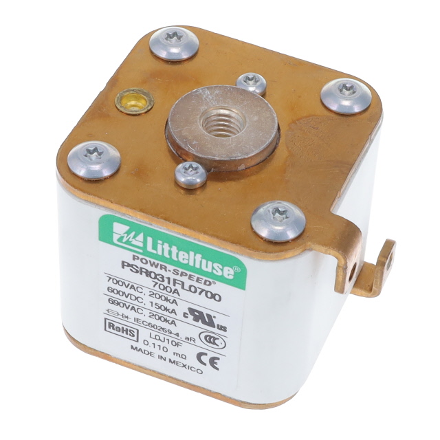 This is manufactured by Littelfuse Inc.. The manufacturer part number is PSR031FL0700Z. It is assigned with possible HTSUS value of 8536.10.0040. The product is rohs3 compliant. Whereas, the breaking capacity of the product at rated voltage is 200ka ac, 150ka dc. 600 vdc of DC voltage rating. The product has -55°c ~ 125°c operating temperature range. It is approved by ccc, ce, curus, ul. The product exhibits 700 vac of AC voltage rating. In addition, it is reach unaffected. The product is widely employed in semiconductors. It has a 98187.0 melting I²t. It responds within fast blow. The littelfuse inc.'s product offers user-desired applications. The product's diameters include 1.969" l x 2.028" w x 2.264" h (50.00mm x 51.50mm x 57.50mm). It has a long 15 weeks standard lead time. Additionally, the product's output is 700a. Its typical moisture sensitivity level is not applicable. The splendid features of the product include indicating. The product is available in bolt mount configuration. The product powr-speed® psr, is a highly preferred choice for users. In addition, box is the available packaging type of the product. It integrates a square fuse type. The product is designated with the ear99 code number.