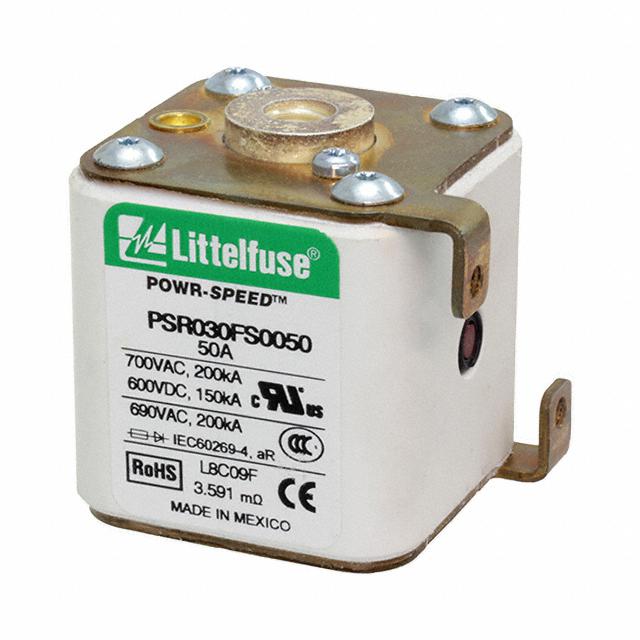 This is manufactured by Littelfuse Inc.. The manufacturer part number is PSR030FS0050Z. It is assigned with possible HTSUS value of 8536.10.0040. The product is rohs3 compliant. Whereas, the breaking capacity of the product at rated voltage is 200ka ac, 150ka dc. 600 vdc of DC voltage rating. The product has -55°c ~ 125°c operating temperature range. It is approved by ccc, ce, curus, ul. The product exhibits 700 vac of AC voltage rating. In addition, it is reach unaffected. The product is widely employed in semiconductors. It has a 110 melting I²t. It responds within fast blow. It is shipped in box package . The product's diameters include 1.969" l x 1.693" w x 1.929" h (50.00mm x 43.00mm x 49.00mm). It has a long 30 weeks standard lead time. Additionally, the product's output is 50a. Its typical moisture sensitivity level is not applicable. The splendid features of the product include indicating. The product is available in bolt mount configuration. The product powr-speed® psr, is a highly preferred choice for users. It integrates a square fuse type. The product is designated with the ear99 code number.