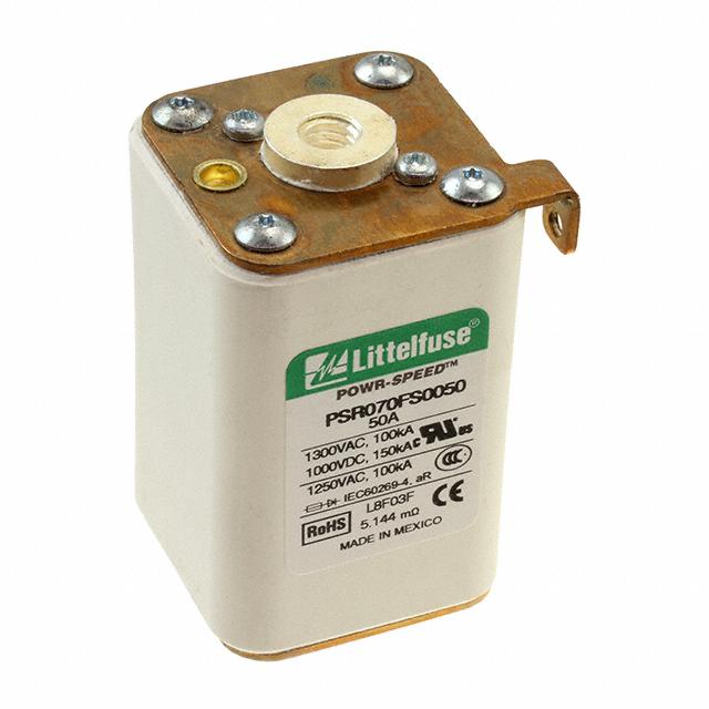 This is manufactured by Littelfuse Inc.. The manufacturer part number is PSR070FS0050Z. It is assigned with possible HTSUS value of 8535.10.0040. The product is rohs3 compliant. Whereas, the breaking capacity of the product at rated voltage is 100ka ac, 150ka dc. 1 kvdc of DC voltage rating. The product has -55°c ~ 125°c operating temperature range. It is approved by ccc, ce, curus, ul. The product exhibits 1.3 kvac of AC voltage rating. In addition, it is reach unaffected. The product is widely employed in semiconductors. It has a 177.0 melting I²t. It responds within fast blow. The littelfuse inc.'s product offers user-desired applications. The product's diameters include 2.913" l x 1.693" w x 1.929" h (74.00mm x 43.00mm x 49.00mm). It has a long 30 weeks standard lead time. Additionally, the product's output is 50a. Its typical moisture sensitivity level is not applicable. The splendid features of the product include indicating. The product is available in bolt mount configuration. The product powr-speed® psr, is a highly preferred choice for users. In addition, box is the available packaging type of the product. It integrates a square fuse type. The product is designated with the ear99 code number.