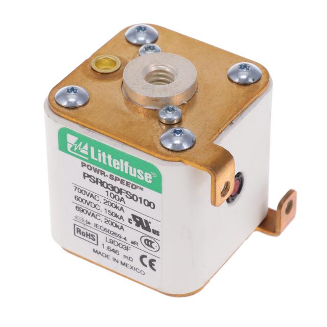 This is manufactured by Littelfuse Inc.. The manufacturer part number is PSR030FS0100Z. It is assigned with possible HTSUS value of 8536.10.0040. The product is rohs3 compliant. Whereas, the breaking capacity of the product at rated voltage is 200ka ac, 150ka dc. 600 vdc of DC voltage rating. The product has -55°c ~ 125°c operating temperature range. It is approved by ccc, ce, curus, ul. The product exhibits 700 vac of AC voltage rating. In addition, it is reach unaffected. The product is widely employed in semiconductors. It has a 437.0 melting I²t. It responds within fast blow. The littelfuse inc.'s product offers user-desired applications. The product's diameters include 1.969" l x 1.693" w x 1.929" h (50.00mm x 43.00mm x 49.00mm). It has a long 30 weeks standard lead time. Additionally, the product's output is 100a. Its typical moisture sensitivity level is not applicable. The product is available in bolt mount configuration. The product powr-speed® psr, is a highly preferred choice for users. In addition, bulk is the available packaging type of the product. It integrates a square fuse type. The product is designated with the ear99 code number.