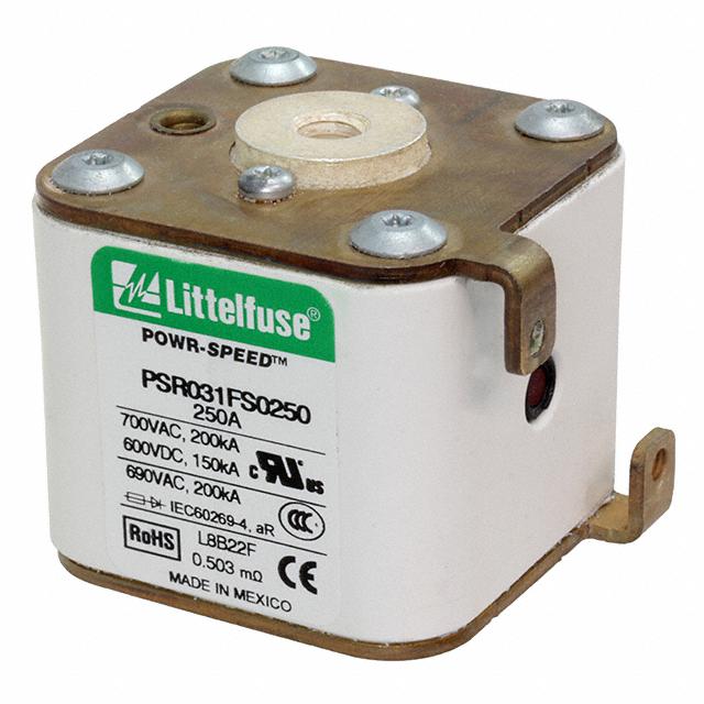 This is manufactured by Littelfuse Inc.. The manufacturer part number is PSR031FS0250Z. It is assigned with possible HTSUS value of 8536.10.0040. The product is rohs3 compliant. Whereas, the breaking capacity of the product at rated voltage is 200ka ac, 150ka dc. 600 vdc of DC voltage rating. The product has -55°c ~ 125°c operating temperature range. It is approved by ccc, ce, curus, ul. The product exhibits 700 vac of AC voltage rating. In addition, it is reach unaffected. The product is widely employed in semiconductors. It has a 3789.0 melting I²t. It responds within fast blow. The littelfuse inc.'s product offers user-desired applications. The product's diameters include 1.969" l x 2.028" w x 2.264" h (50.00mm x 51.50mm x 57.50mm). It has a long 30 weeks standard lead time. Additionally, the product's output is 250a. Its typical moisture sensitivity level is not applicable. The product is available in bolt mount configuration. The product powr-speed® psr, is a highly preferred choice for users. In addition, bulk is the available packaging type of the product. It integrates a square fuse type. The product is designated with the ear99 code number.