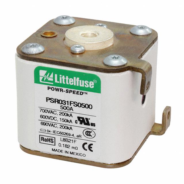 This is manufactured by Littelfuse Inc.. The manufacturer part number is PSR031FS0500Z. It is assigned with possible HTSUS value of 8536.10.0040. The product is rohs3 compliant. Whereas, the breaking capacity of the product at rated voltage is 200ka ac, 150ka dc. 600 vdc of DC voltage rating. The product has -55°c ~ 125°c operating temperature range. It is approved by ccc, ce, curus, ul. The product exhibits 700 vac of AC voltage rating. In addition, it is reach unaffected. The product is widely employed in semiconductors. It responds within fast blow. The littelfuse inc.'s product offers user-desired applications. The product's diameters include 1.969" l x 2.028" w x 2.264" h (50.00mm x 51.50mm x 57.50mm). It has a long 30 weeks standard lead time. Additionally, the product's output is 500a. Its typical moisture sensitivity level is not applicable. The product is available in bolt mount configuration. The product powr-speed® psr, is a highly preferred choice for users. In addition, bulk is the available packaging type of the product. It integrates a square fuse type. The product is designated with the ear99 code number.
