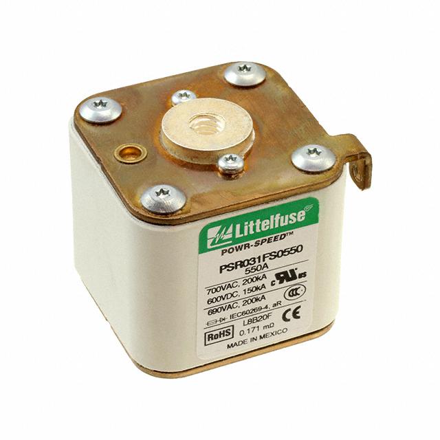 This is manufactured by Littelfuse Inc.. The manufacturer part number is PSR031FS0550Z. It is assigned with possible HTSUS value of 8536.10.0040. The product is rohs3 compliant. Whereas, the breaking capacity of the product at rated voltage is 200ka ac, 150ka dc. 600 vdc of DC voltage rating. The product has -55°c ~ 125°c operating temperature range. It is approved by ccc, ce, curus, ul. The product exhibits 700 vac of AC voltage rating. In addition, it is reach unaffected. The product is widely employed in semiconductors. It responds within fast blow. The littelfuse inc.'s product offers user-desired applications. The product's diameters include 1.969" l x 2.028" w x 2.264" h (50.00mm x 51.50mm x 57.50mm). It has a long 30 weeks standard lead time. Additionally, the product's output is 550a. Its typical moisture sensitivity level is not applicable. The product is available in bolt mount configuration. The product powr-speed® psr, is a highly preferred choice for users. In addition, bulk is the available packaging type of the product. It integrates a square fuse type. The product is designated with the ear99 code number.