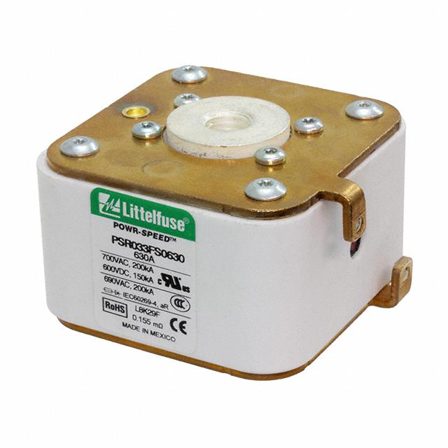 This is manufactured by Littelfuse Inc.. The manufacturer part number is PSR033FS0630Z. It is assigned with possible HTSUS value of 8536.10.0040. The product is rohs3 compliant. Whereas, the breaking capacity of the product at rated voltage is 200ka ac, 150ka dc. 600 vdc of DC voltage rating. The product has -55°c ~ 125°c operating temperature range. It is approved by ccc, ce, curus, ul. The product exhibits 700 vac of AC voltage rating. In addition, it is reach unaffected. The product is widely employed in semiconductors. It has a 38727 melting I²t. It responds within fast blow. It is shipped in bulk package . The product's diameters include 2.008" l x 2.894" w x 3.130" h (51.00mm x 73.50mm x 79.50mm). It has a long 30 weeks standard lead time. Additionally, the product's output is 630a. Its typical moisture sensitivity level is not applicable. The product is available in bolt mount configuration. The product powr-speed® psr, is a highly preferred choice for users. It integrates a square fuse type. The product is designated with the ear99 code number.
