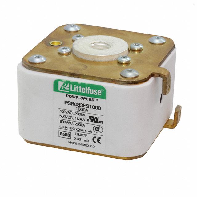 This is manufactured by Littelfuse Inc.. The manufacturer part number is PSR033FS1000Z. It is assigned with possible HTSUS value of 8536.10.0040. The product is rohs3 compliant. Whereas, the breaking capacity of the product at rated voltage is 200ka ac, 150ka dc. 600 vdc of DC voltage rating. The product has -55°c ~ 125°c operating temperature range. It is approved by ccc, ce, curus, ul. The product exhibits 700 vac of AC voltage rating. In addition, it is reach unaffected. The product is widely employed in semiconductors. It has a 222350 melting I²t. It responds within fast blow. It is shipped in bulk package . The product's diameters include 2.008" l x 2.894" w x 3.130" h (51.00mm x 73.50mm x 79.50mm). It has a long 30 weeks standard lead time. Additionally, the product's output is 1ka. Its typical moisture sensitivity level is not applicable. The product is available in bolt mount configuration. The product powr-speed® psr, is a highly preferred choice for users. It integrates a square fuse type. The product is designated with the ear99 code number.