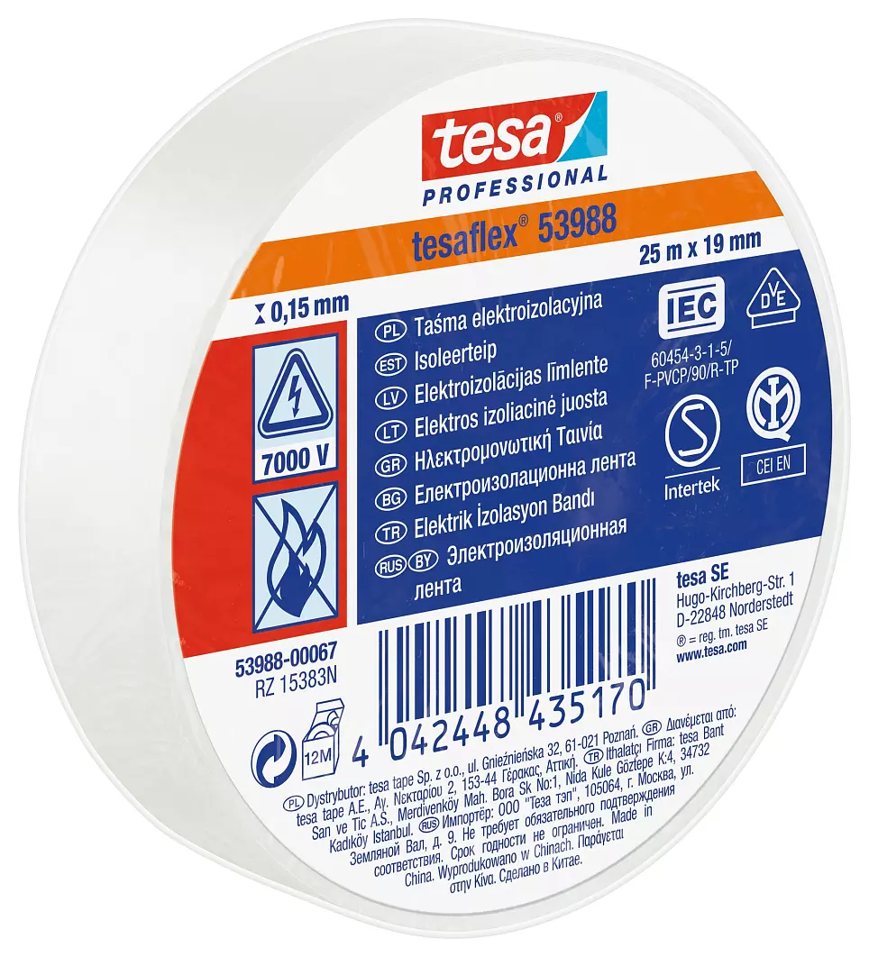 This is Black Electrical Tape 19mm x 25m manufactured by Tesa. The manufacturer part number is 53988. It is assigned with a trade name of 53988. It has a decent white colour. It is 0.15mm thick. Furthermore, the product is 19mm wide. Its accurate length is 25m. It has a maximum operating temperature of +90°c. Whereas, its backing is made using pvc material .